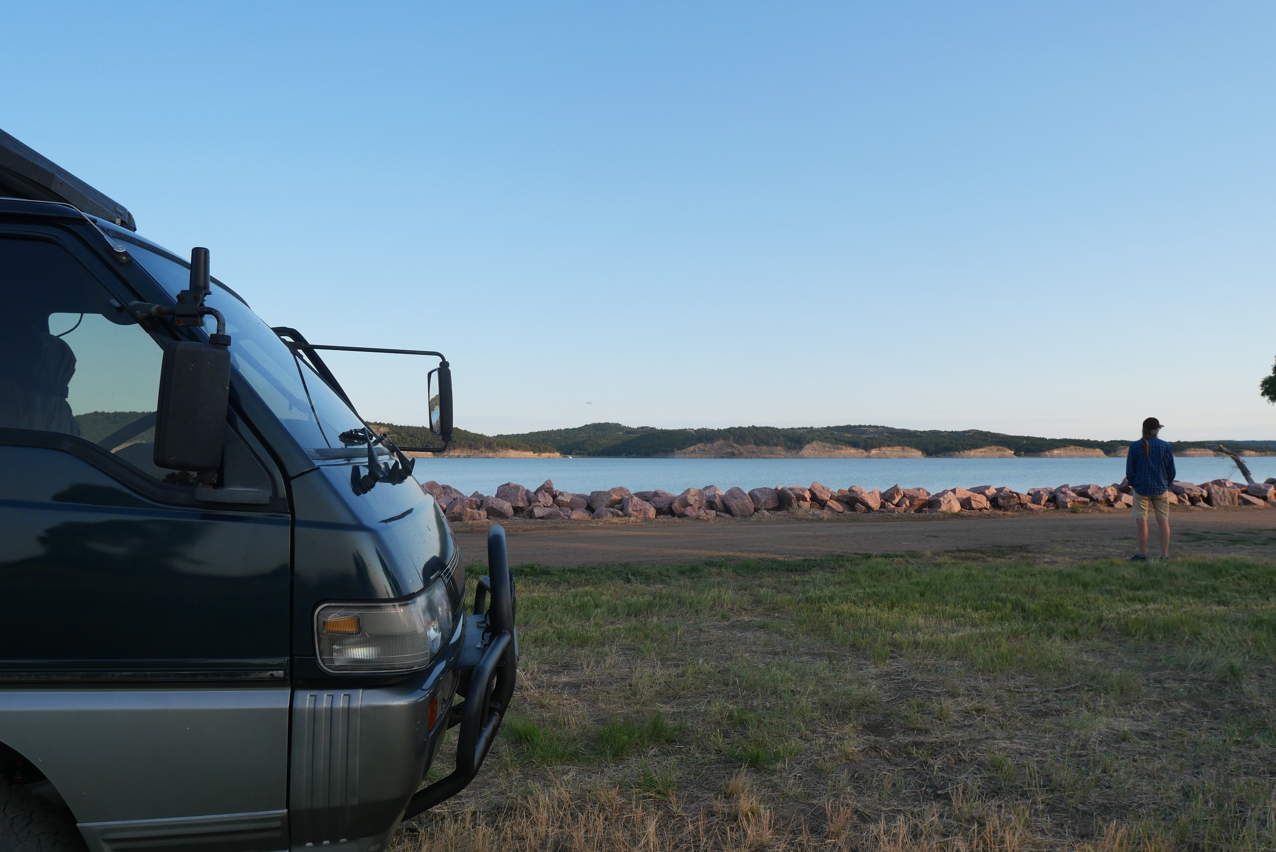 Later that day, we arrived in Oacoma, South Dakota, and found the free camping site alongside the Missouri River. There weren’t many people there, and according to a policeman we stopped, we could camp anywhere. We found a spot away from everyone else and set up camp.