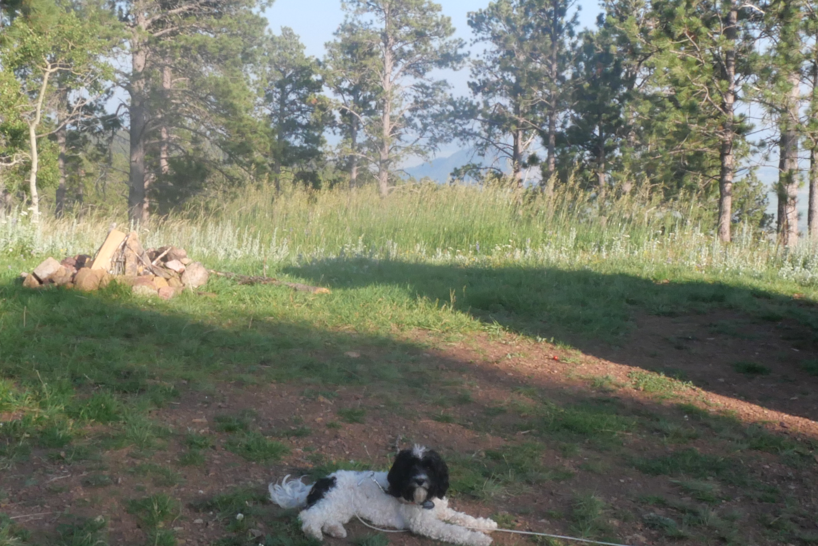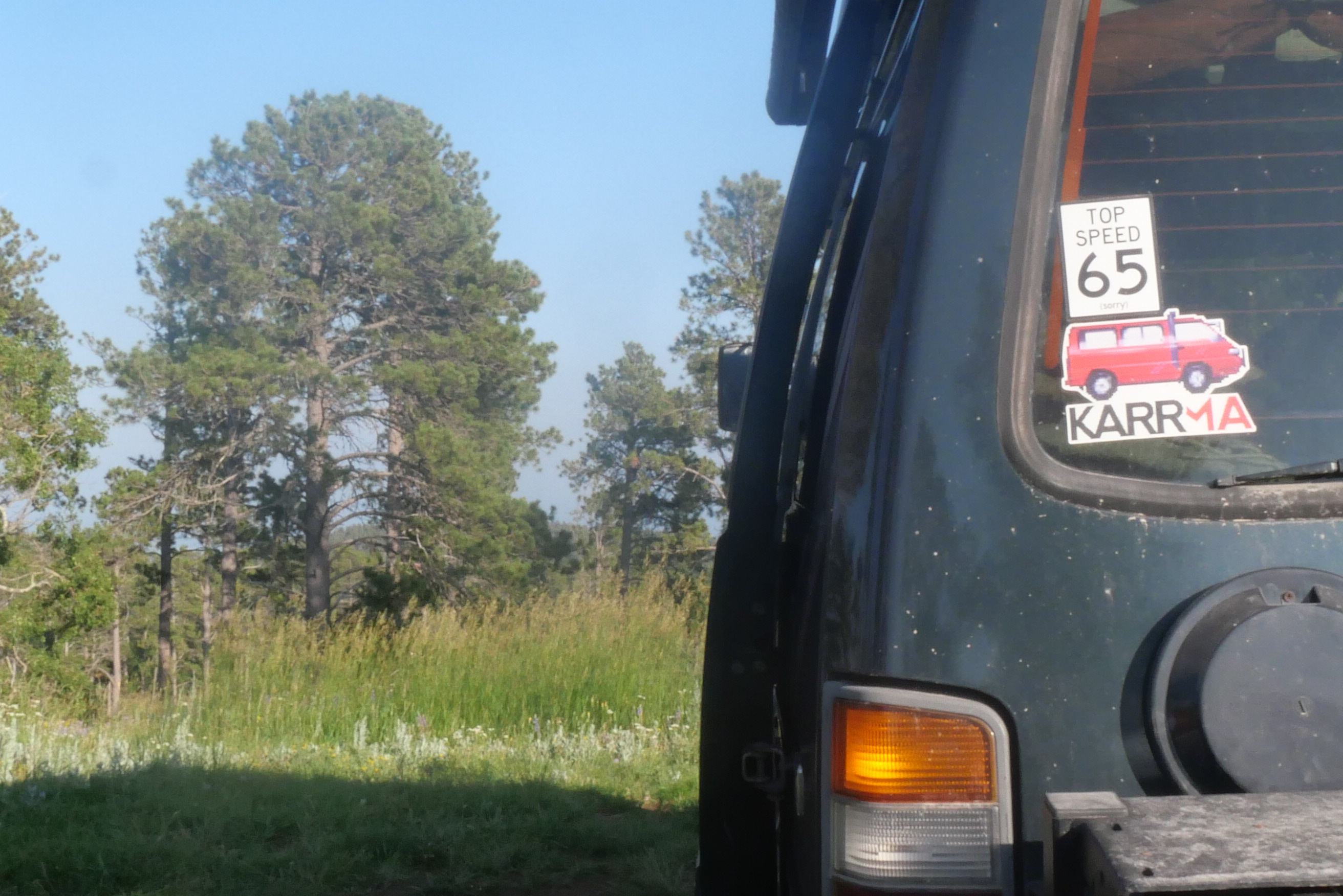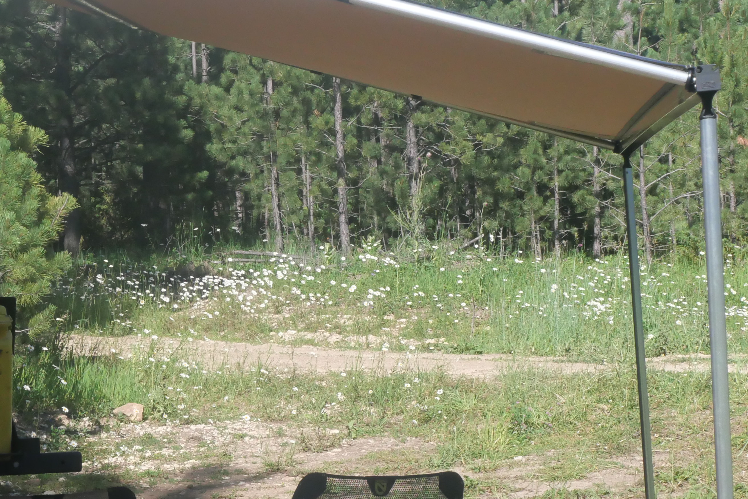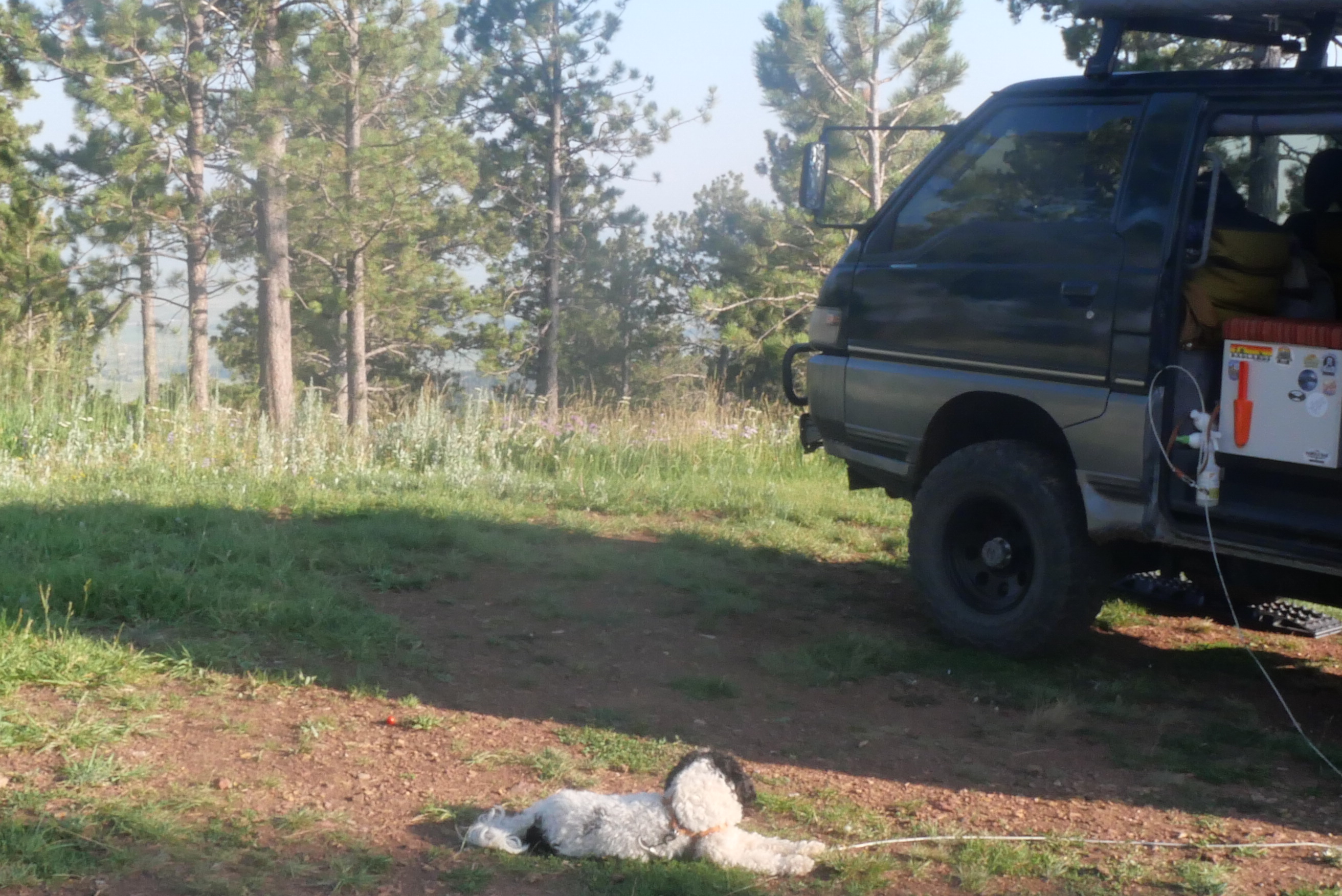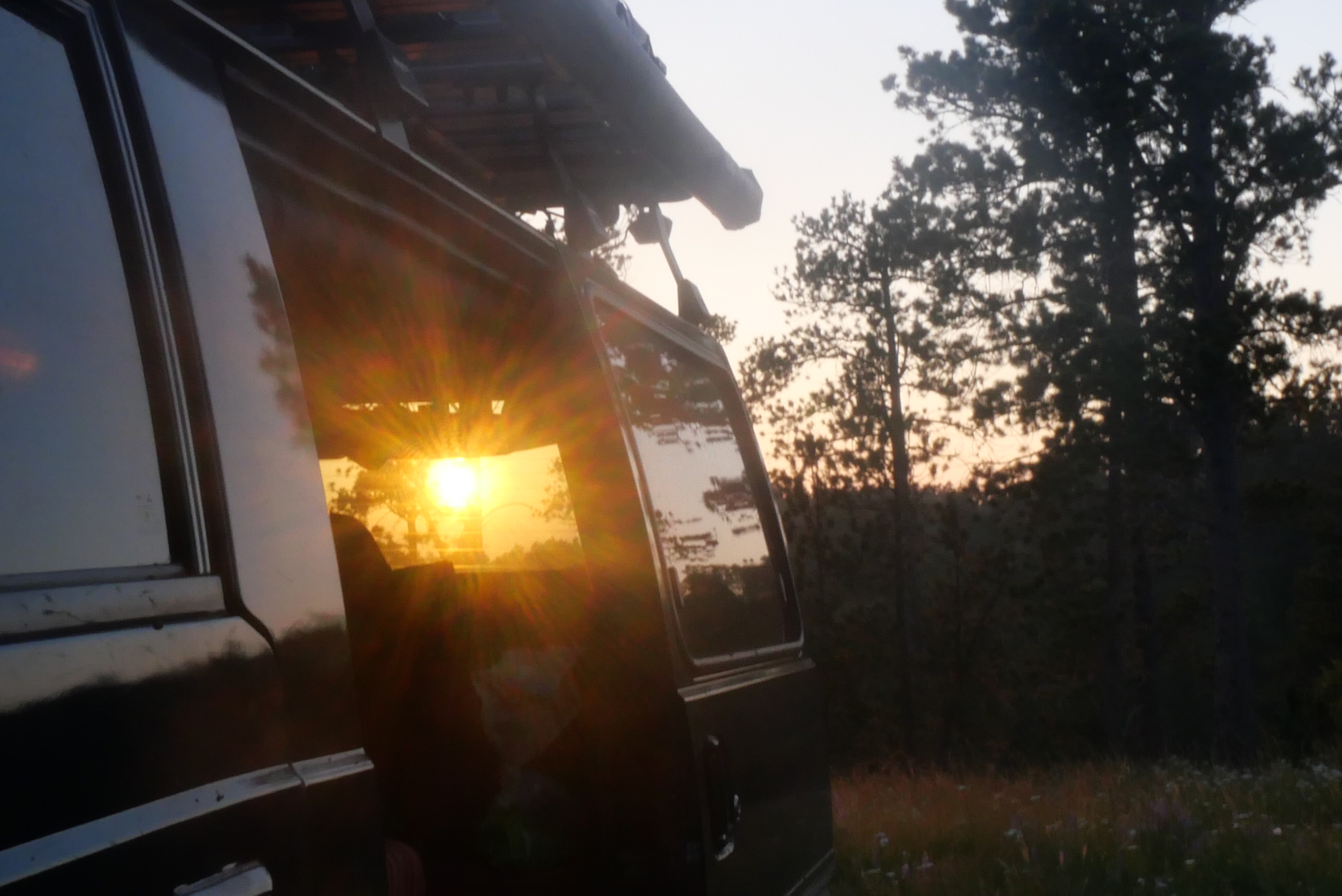 After leaving Spearfish Canyon, we headed to Wyoming. There is Black Hills National Forest not too far from the South Dakota border. We were going to camp at a forest service pay campground near Sundance, but we decided to explore first. We passed the campground and continued up the road until we saw an offshoot of the main road. Pulling in, we saw a van and then a trailer. Just a little further up the rocky 4WD-worthy road, we came to the end at the top of the hill. It was the best dispersed camping spot yet. Beautiful views through the trees of Ragged Top Peak, fields of wildflowers surrounding us, and a copse of quaking aspens.