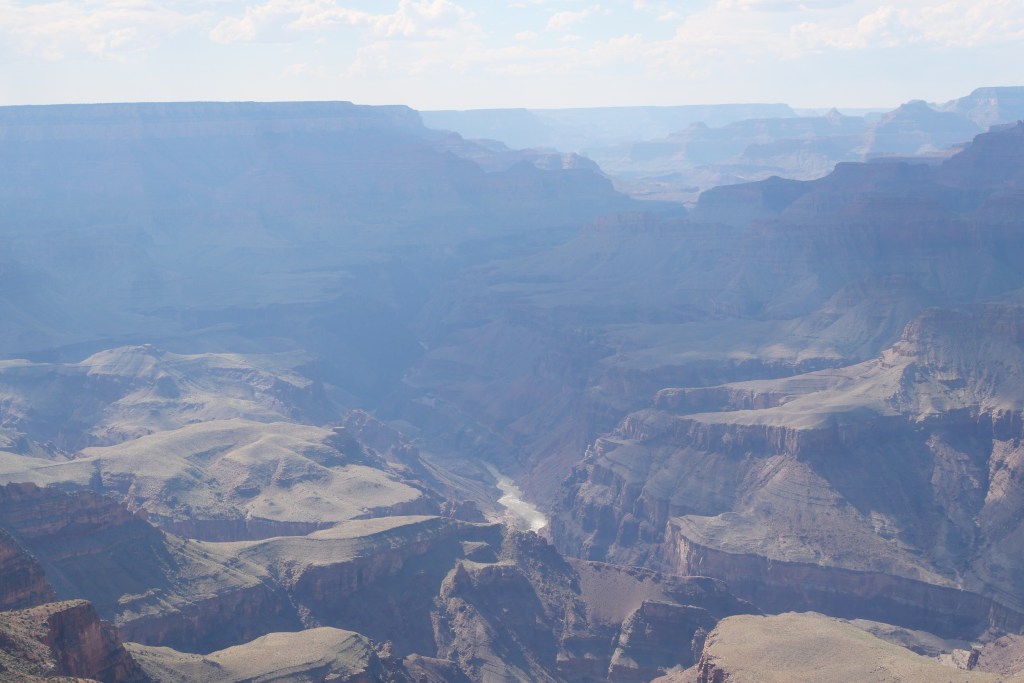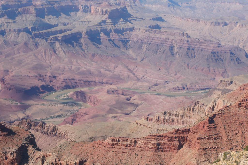 Above is a picture of the Colorado River, which is at the lowest point in the Canyon. It can’t etch any further down because the hard ancient rocks there resist erosion. The leftmost point of the river in the picture is at Vishnu Basement Rock. The rightmost point of the river in the picture is Hance Rapid.