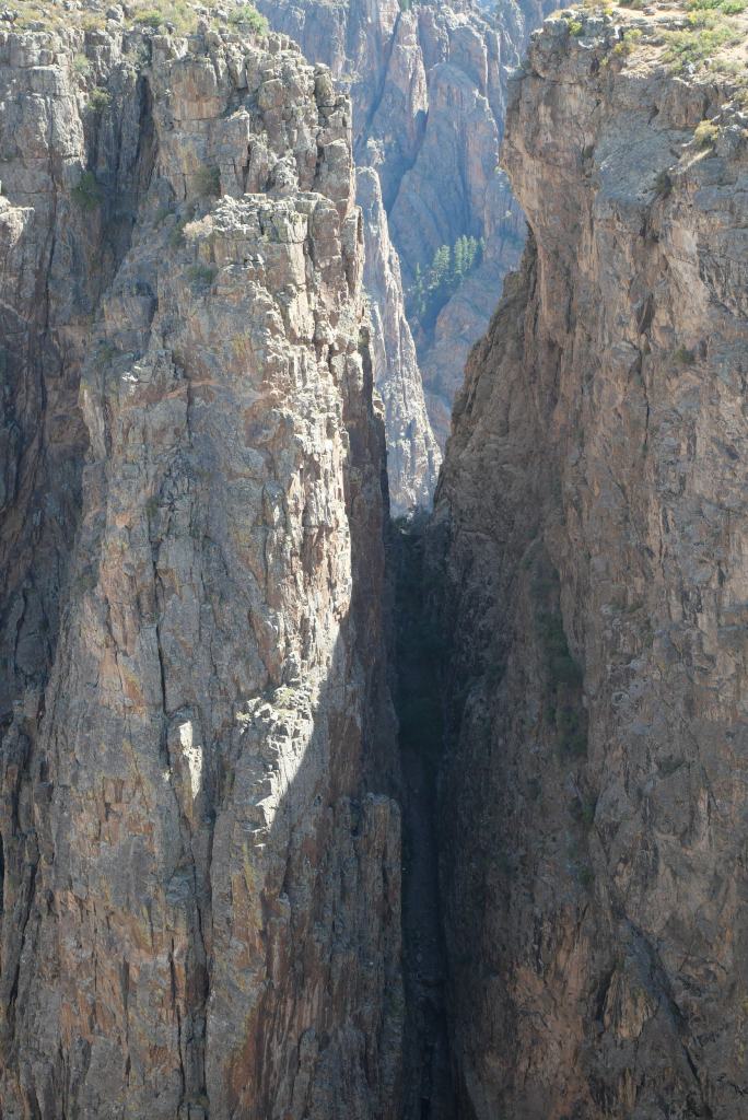 The Gunnison River created this canyon over two million years, creating some of the steepest cliffs and oldest rocks in North America. At the bottom, it is only 40-feet wide. The steep cliffs and narrowness prevent much sunshine from reaching into it, hence the name Black Canyon.